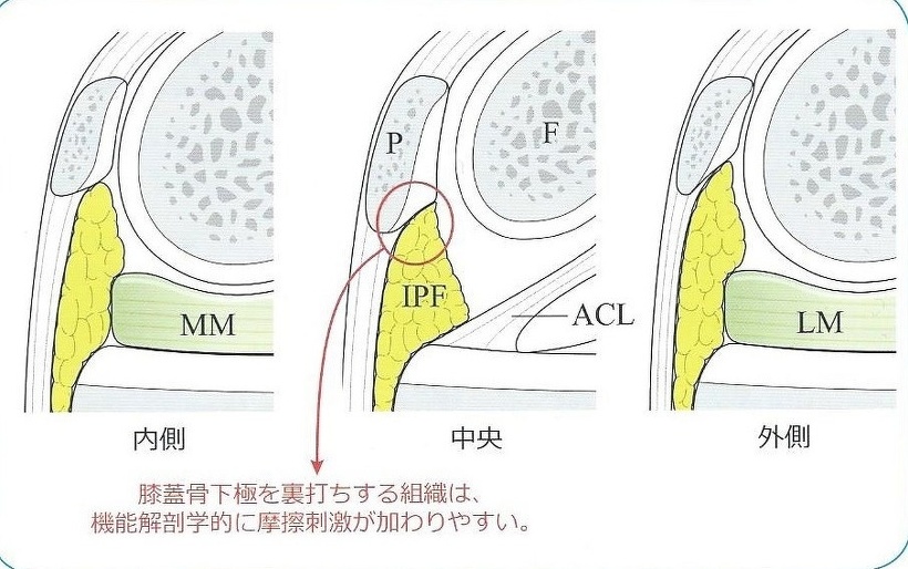 しかし、この「膝蓋下脂肪体」が何らかの理由で動きが悪くなる(滑走障害)と炎症を起こしたりします。