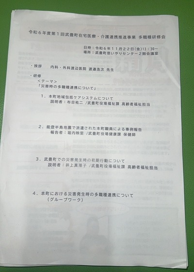 研修も最後にグループワークを行いましたがテーブルに集まった多職種の方々の災害発生時の連携についての1人、1人の話に耳を傾けながら自分の事業所はどうかと比べながら聞いていて感心や勉強になる事ばかりで目からうろこのような研修でした。