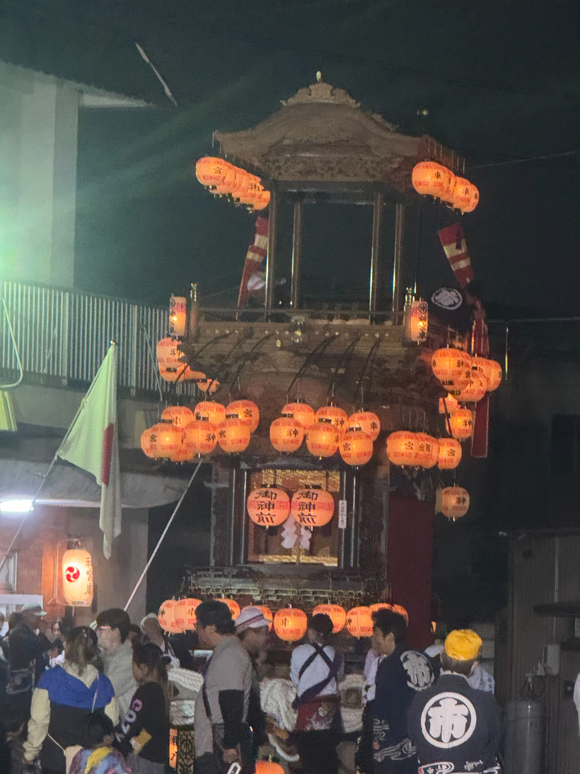 まずは前夜祭という事で夜に山車に提灯をつけて練り歩くという事でなんとも幻想的な感じで素晴らしかったです。