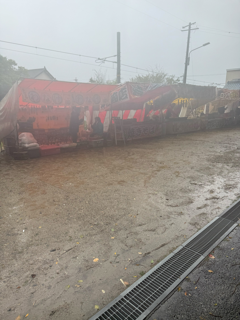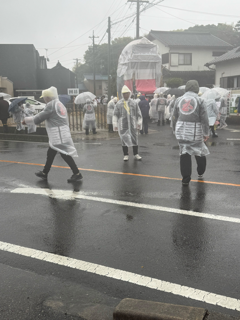 翌日は今年は残念ながら雨天の中地元の武雄神社で山車に雨具をかけた状態で6台が集結しだしていて昨年はキッチンカーや地元商店が開いた店が多くて観衆も多かったですが雨天の中今年は出店も出ていました出店の人も雨の中大変そうでしたが山車をひく方はそんな雨の中に負けない勢いでひいていました。その姿が祭りらしく華やかな雰囲気になってました。