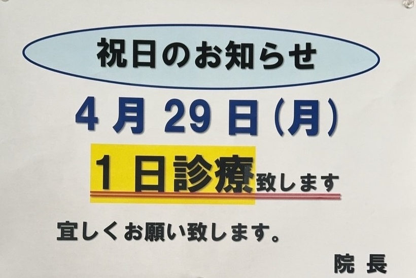 当日は昭和の日で祝日ですが1日通常診療いたします。