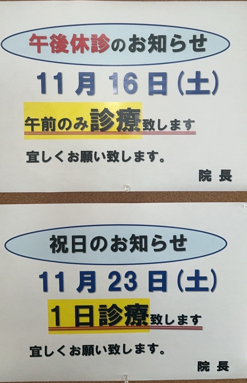 診療時間の変更です。 今週土曜日(11月16日)は午前のみの診察となります。 来週土曜日(11月23日)は祝日ですが1日診療致します。 よろしくご確認お願い致します。