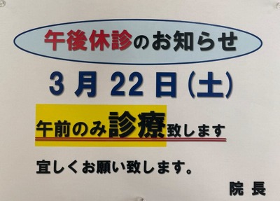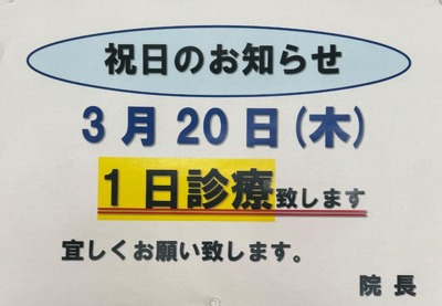3月20日木曜日は終日診療となります。 3月22日土曜日は午前のみ診療となります。 お間違えのないようご来院ください。 以上よろしくお願い申し上げます。