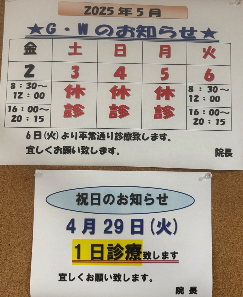 4月29日(火曜日)祝日は終日診療となります。 GW期間中 5月2日(金曜日)は通常診療となります。 5月3日(土曜日)~5月5日(月曜日)休診いたします。 5月6日(火曜日)から通常診療となります。 お間違えのないようご来院ください。 以上よろしくお願い申し上げます。