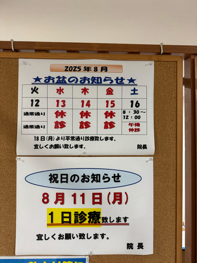 8月11日(月曜日)は1日診療致します。 8月12日(火曜日)は通常診療となります。 8月13日(水曜日)~8月15日(金曜日)休診致します。 8月16日(土曜日)は午前のみの診療となります。 8月18日(月曜日) より平常通り診療致します。 お間違えのないようご来院ください。 以上よろしくお願い申し上げます。